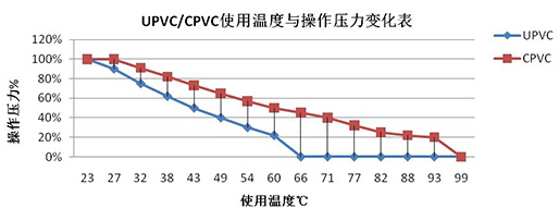 本表系以常溫73℉(23℃)時,UPVC/CPVC管道之使用操作壓力為100%,隨著溫度的升高,其操作壓力殘余的百分比。